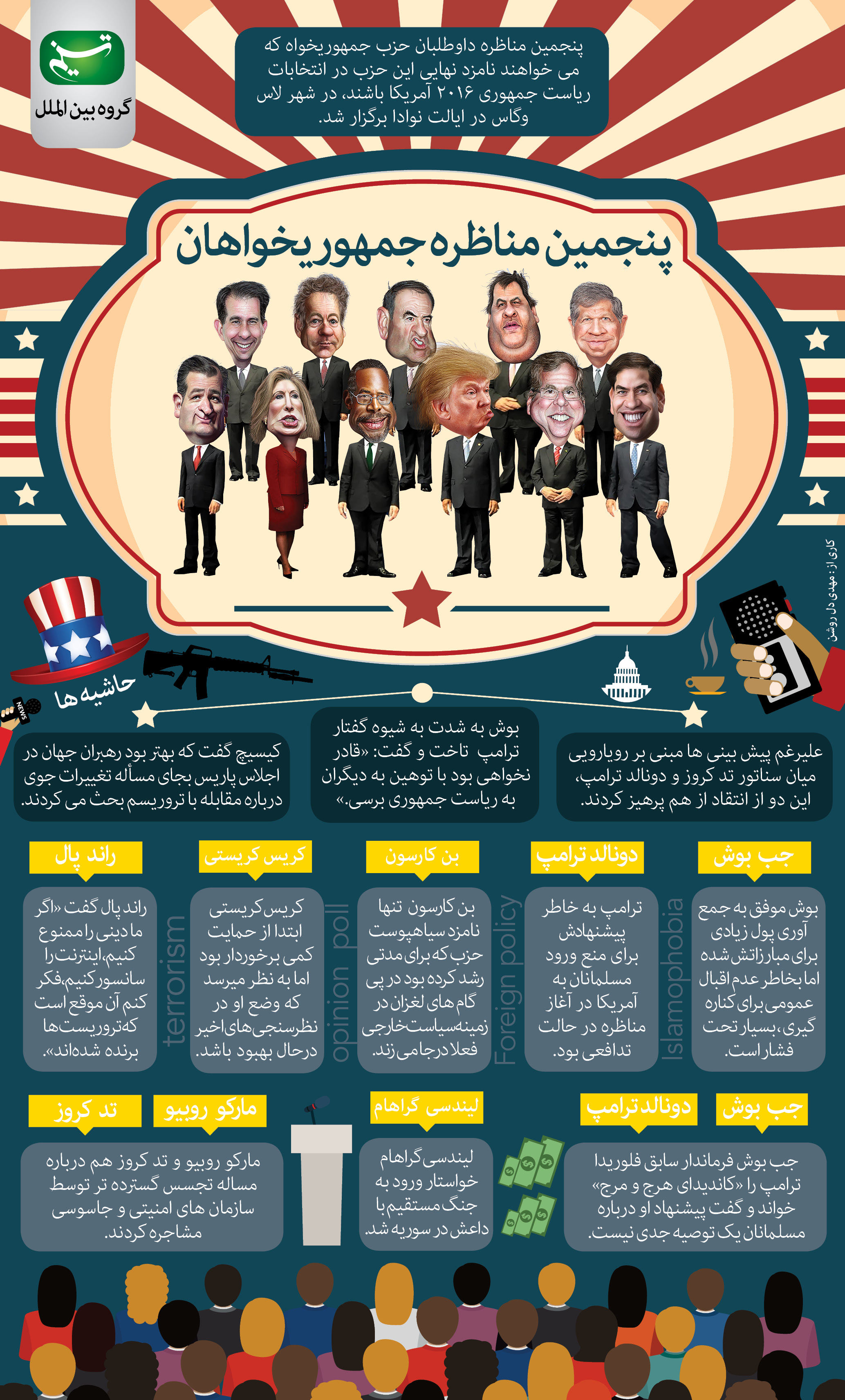 داوطلبان حزب جمهوری خواه برای پنجمین بار در مقابل هم صف آرایی کردند تا گامی دیگر به انتخاب نهایی کاندیدای حزب قدیمی برای شرکت در انتخابات ریاست جمهوری سال 2016، نزدیک شوند.
