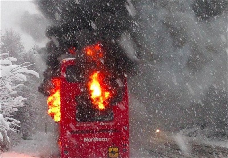 حریق اتوبوس دو طبقه انگلیسی در برف