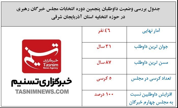 در دور پنجم از مجلس خبرگان نیز که در هفته اخیر ثبت نام آن آغاز شد، برای سهمیه 5 نفری کرسی نمایندگی مجلس خبرگان 46 نفر ثبت نام کردند که در این میان، همه نمایندگان دور گذشته ثبت نام کردند و اسامی آنها به شرح ذیل معرفی میشود: