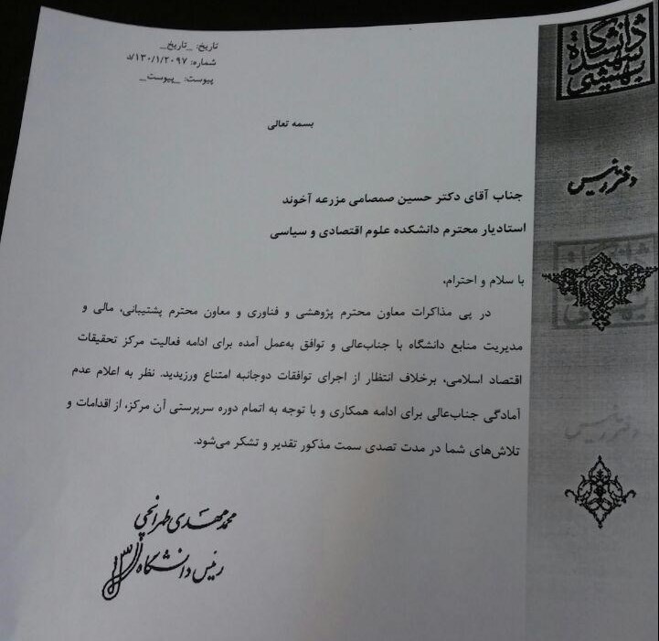 بررسی های خبرنگار اقتصادی خبرگزاری تسنیم نشان از نکته ای کم سابقه در نامه برکناری رئیس مرکز دارد که مشخص می کند، حسین صمصامی از برکناری خود بی اطلاع بوده است. در این نامه «بدون تاریخ» خطاب به مسئول سابق این مرکز آمده است «در پی مذاکرات .... با جنابعالی و توافق به عمل آمده برای ادامه فعالیت مرکز تحقیقات اقتصاد اسلامی، برخلاف انتظار از اجرای توافقات دوجانبه امتناع ورزیدید. نظر به اعلام عدم آمادگی جنابعالی برای ادامه همکاری و با توجه به اتمام دوره سرپرستی آن مرکز، از اقدامات و تلاشهای شما در مدت تصدی سمت مذکور تقدیر و تشکر می شود.»