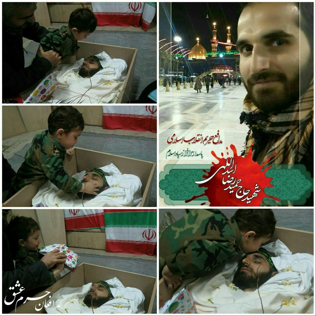تصویری که میبیند برای مجاهدان راه خدا آشناست. صحنهی وداع فرزند خردسال شهید حمیدرضا اسداللهی است. این شهید چند روز قبل، در دفاع از حریم حضرت زینب (علیها السلام) به شهادت رسید.