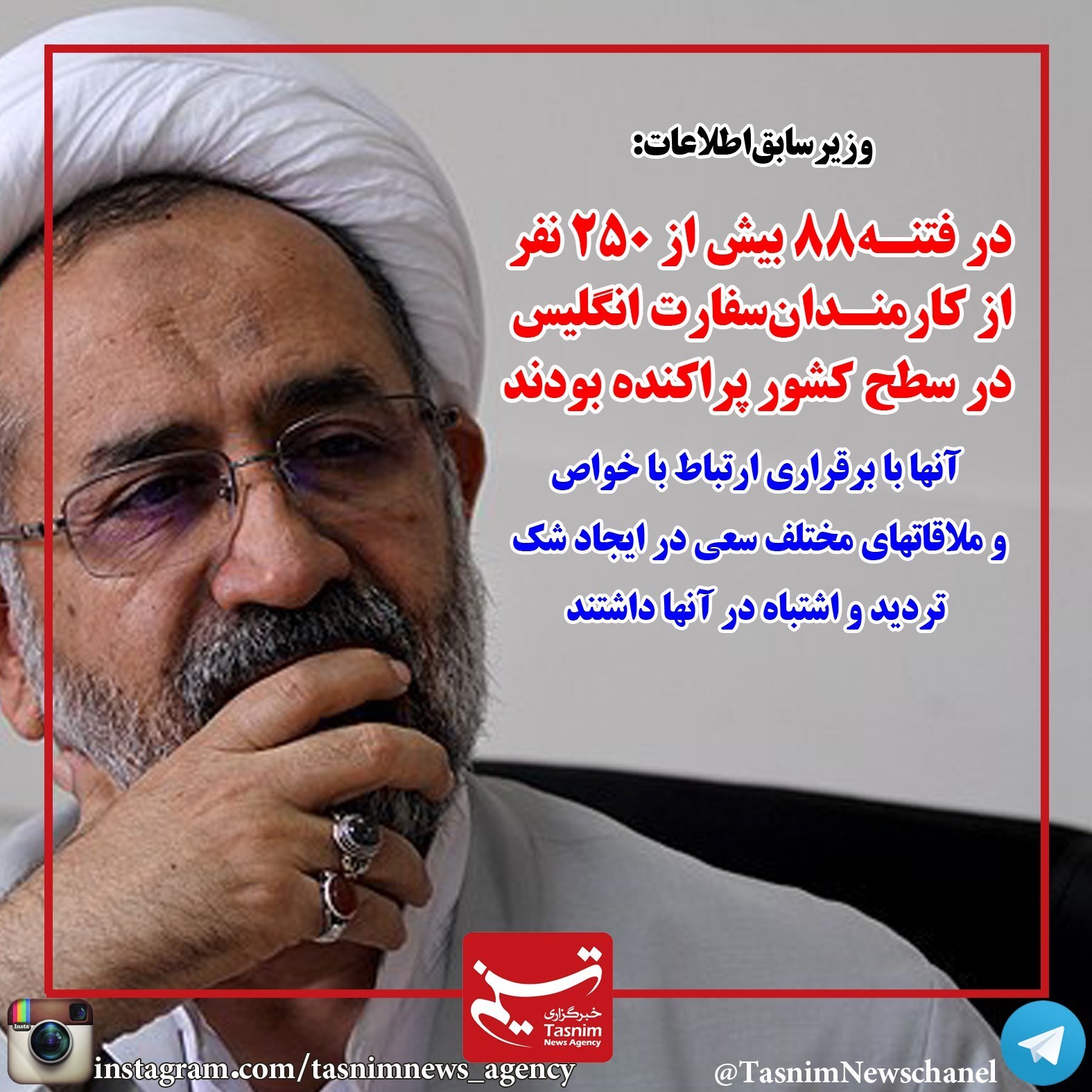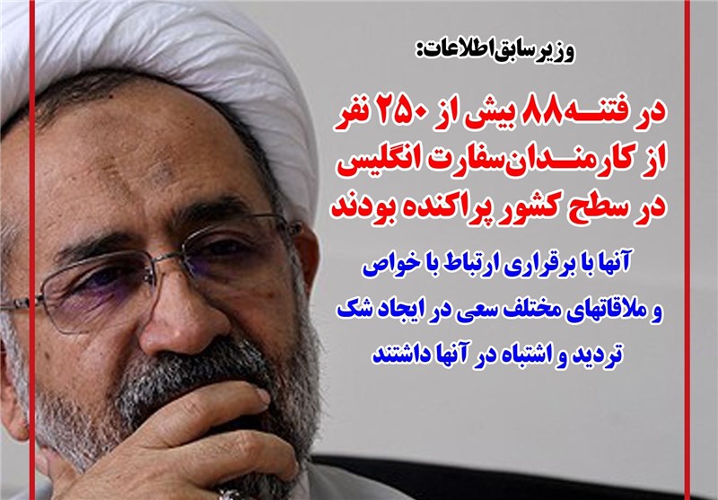 وزیر سابق اطلاعات گفت: در فتنه88 بیش از 250 نفر از کارمندان سفارت انگلیس در سطح کشور پراکنده بودند آنها با برقراری ارتباط با خواص و ملاقاتهای مختلف سعی در ایجاد شک، تردید و اشتباه در آنها داشتند.