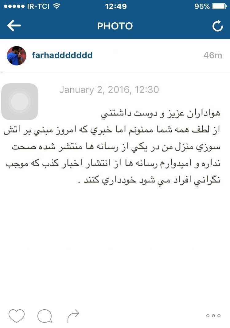 به گزارش خبرگزاری تسنیم، فرهاد مجیدی در صفحه اینستاگرام خود نوشت: از لطف همه شما ممنونم، اما خبری که امروز مبنی بر آتشسوزی منزل من در یکی از رسانهها منتشر شده است، صحت ندارد. امیدوارم رسانهها از انتشار اخبار کذب که موجب نگرانی افراد میشود، خودداری کنند.