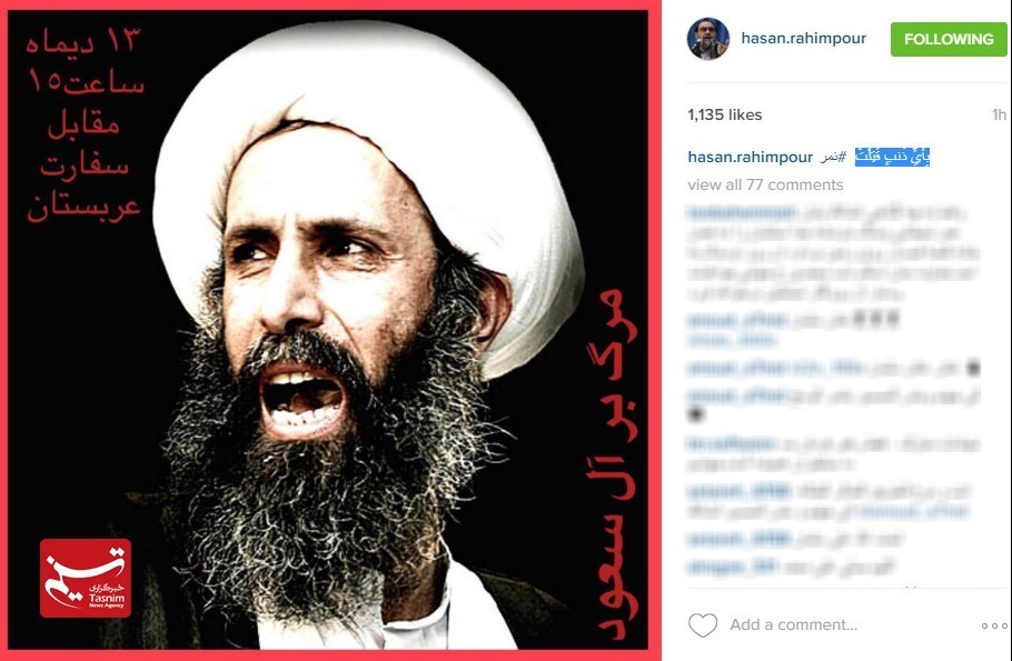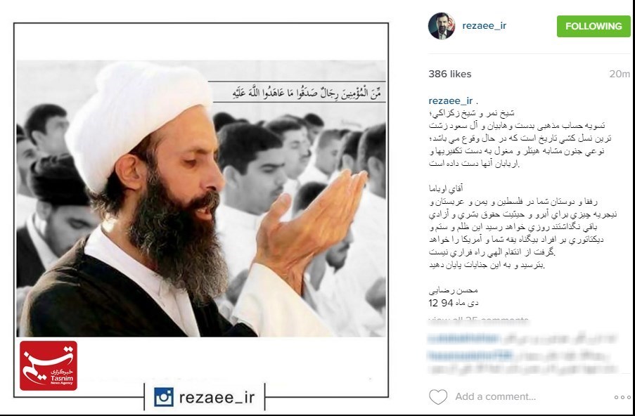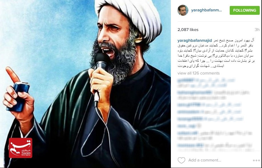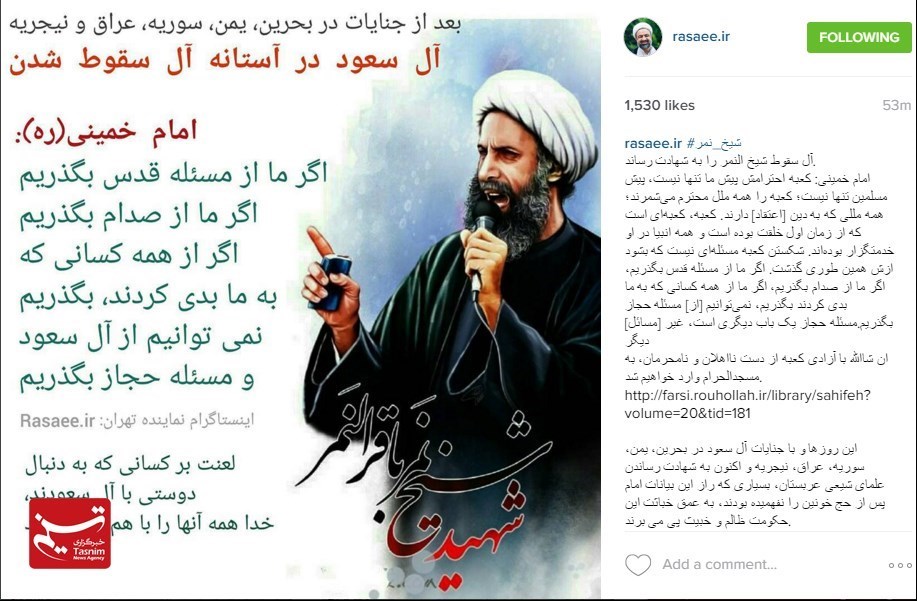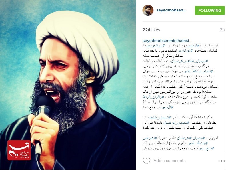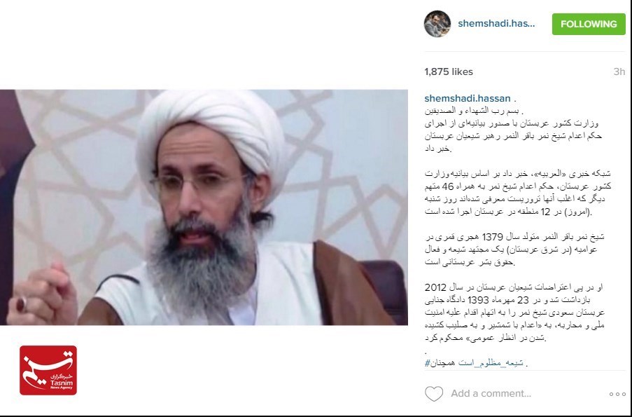 آل یهود امروز صبح شیخ نمر باقر النمر را اعدام کرد... کجایند مدعیان دروغین حقوق بشر؟! کجایند کذابان حمایت از آزادی بیان؟! کجایند یاوه سرایان مبارزه با دیکتاتوری؟! پی نوشت: شیخ باقر! خدا بر تو بشارت داده است بهشت را ... چرا که پای اعتقادت ایستادی... شهادت گوارای وجودت