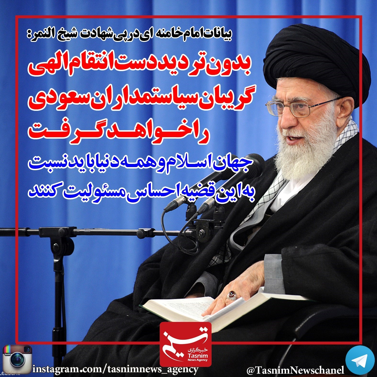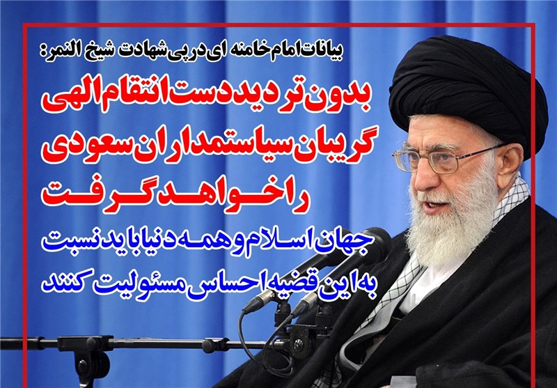 رهبر معظم انقلاب اسلامی با محکومیت شدید قتل عالم مؤمن و مظلوم شیخ نمر گفتند: بدون تردید دست انتقام الهی گریبان سیاستمداران سعودی را خواهد گرفت.
