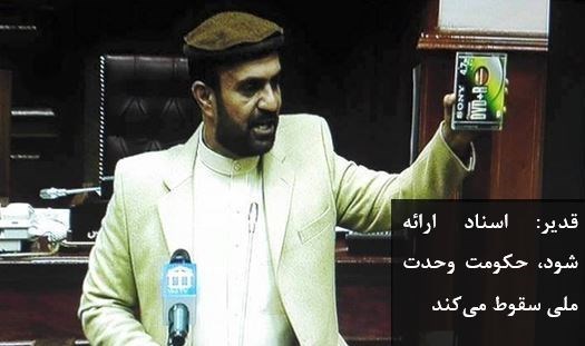 معاون اول پارلمان افغانستان در نشست عمومی چندی قبل به نمایندگان این مجلس در حالی که سیدی در دست داشت، گفت که در صورت ارائه اسناد درون این سیدی، حکومت وحدت ملی افغانستان سقوط میکند.