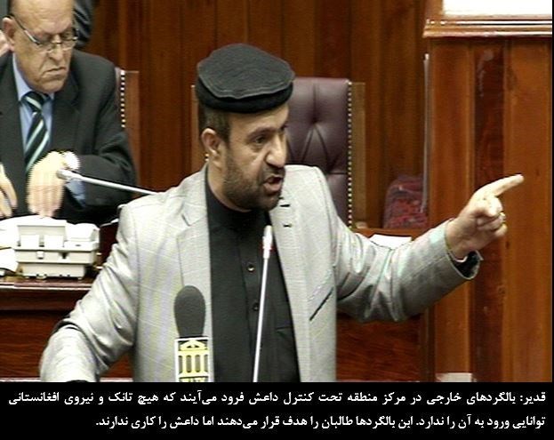 در میان این اختلافات و درگیریها میان این دو گروه، ظاهر قدیر در پارلمان افغانستان مسئله جنجالی دیگری را مطرح کرد؛ بالگردهای خارجی در منطقه تحت کنترل داعش در ولایت ننگرهار به طور مرتب فرود میآیند و جنگندههای خارجی در درگیریهای طالبان افغان و داعش، تنها مواضع طالبان را هدف قرار میدهند اما به داعش کاری ندارند.