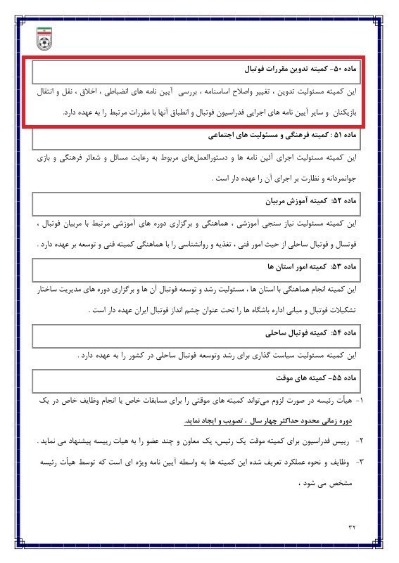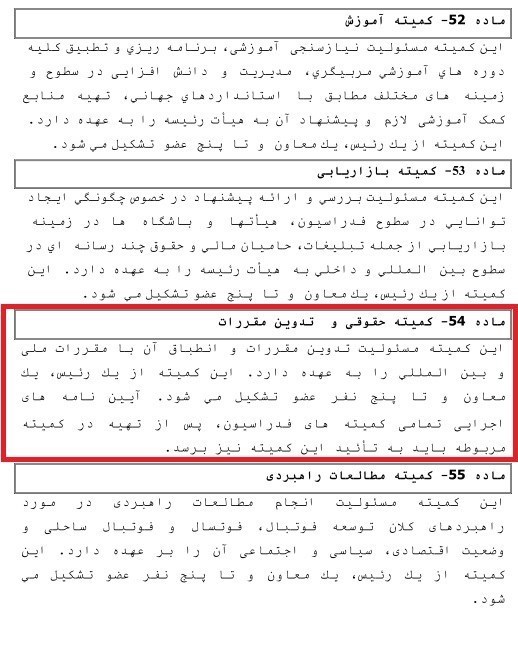 این اتفاق در حالی رخ داده که تغییر جالب توجهی هم در ماده 54 اساسنامه فدراسیون فوتبال به وجود آمده است. ماده 54- کمیته حقوقی و تدوین مقررات: «این کمیته مسئولیت تدوین مقررات و انطباق آن با مقررات ملی و بینالمللی را به عهده دارد. این کمیته از یک رئیس، یک معاون و تا پنج نفر عضو تشکیل میشود. آییننامههای اجرایی تمامی کمیتههای فدراسیون، پس از تهیه در کمیته مربوطه باید به تأیید این کمیته نیز برسند». در حالی که در چند وقت اخیر بارها نسبت به حضور هوشنگ نصیرزاده، در کمیته حقوقی و تدوین مقررات به دلیل نداشتن مدرک حقوقی اعتراض شده بود حالا واژه حقوقی در اساسنامه اصلاحی حذف شده است. ماده 54 اساسنامه فعلی به ماده 50 تبدیل شده است. ماده 50- کمیته تدوین مقررات فوتبال: «این کمیته مسئولیت تدوین، تغییر و اصلاح اساسنامه، بررسی آییننامههای انضباطی، اخلاق، نقل و انتقال بازیکنان و سایر آییننامههای اجرایی فدراسیون فوتبال و انطباق آنها با مقررات مرتبط را به عهده دارد».