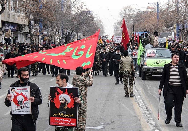 راهپیمایان در ارومیه با در دست گرفتن تصاویر و پوسترهای شهید آیت الله شیخ نمر باقر النمر اعدام این مجاهد فقیه را محکوم کردند.