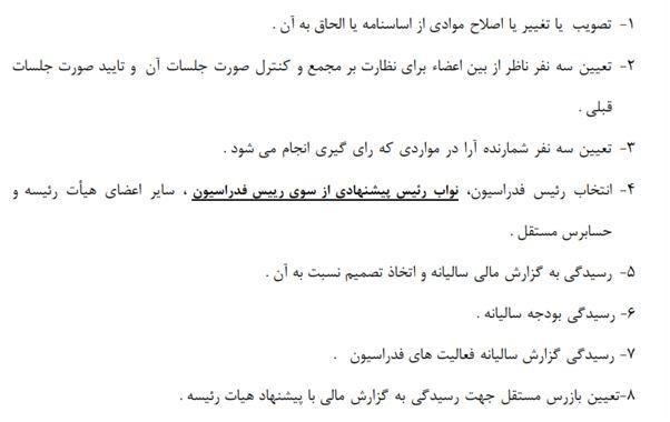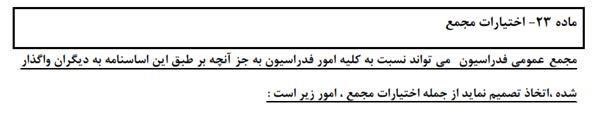 وی ادامه داد: اشتباه فاحش و تناقض در متن همین اساسنامه پیشنهادی است. در بندهای 4 و 8 ماده 23 اساسنامه پیشنهادی، انتخاب بازرس و حسابرس در اختیارات مجمع است که از سویی صراحتاً این انتخاب بر عهده مجمع گذاشته شده و به صورت تفکیکی به عنوان دو مرجع متفاوت در دو بند آمده است اما در کمال تعجب در بند 6 ماده 26 اساسنامه پیشنهادی، مجمع باید انتخاب هیئت رئیسه را تصویب کند در حالی که در بند 4 ماده 23 پیشنهادی گفته شده که مجمع خود انتخاب میکند و قید و شرطی ندارد.
