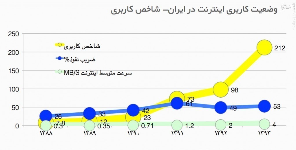 حدفاصل سالهای 1388 تا 1393 میزان استفاده ایرانی ها از اینترنت رشد عجیبی را شاهد بود، این رشد نه تنها در افزایش ضریب نفوذ اینترنت از 26٪ به 53٪ بلکه در افزایش سرعت متوسط اینترنت نیز مشهود بوده است که در نهایت «شاخص کاربری اینترنت» یعنی حاصلضرب ضریب نفوذ در سرعت متوسط اینترنت بیش از 30 برابر شد. (نمودار)