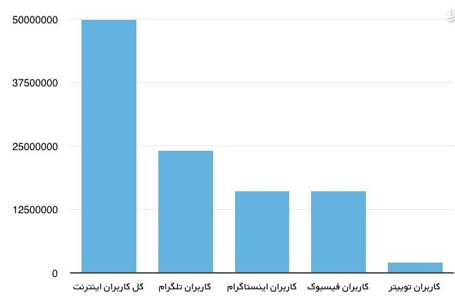 نمودار زیر دربرگیرنده جمعیت تخمینی کاربران ایرانی در تعدادی از مهمترین شبکههای اجتماعی در انتخابات پیش روست. نسبتها براساس تعداد کاربران از کل 50 میلیون کاربر اینترنت در ایران است. با این توضیح که جمعیت موجود در فیسبوک، توییتر و اینستاگرام دربرگیرنده بخشی از ایرانیان خارج ازکشور نیز میشود که در این انتخابات نمیتوانند شرکت کنند اما به دلیل محدودیت در شیوههای محاسباتی با جمعیت کاربران مقیم ایران درهمآمیختهاند. همچنین در تعریف متعارف کسی که حداقل یکبار در ماه به اینترنت متصل شود یا وارد یکی از شبکههای اجتماعی شود یک کاربر محسوب میشود لذا ممکن است فعالیت یک کاربر مثلا در فیسبوک بسیار کمتر از تلگرام باشد اما نمودار زیر نماینده میزان استفاده یا زمان صرف شده نیست و صرفا دربرگیرنده تعداد کاربران براساس تعریف متعارف است.