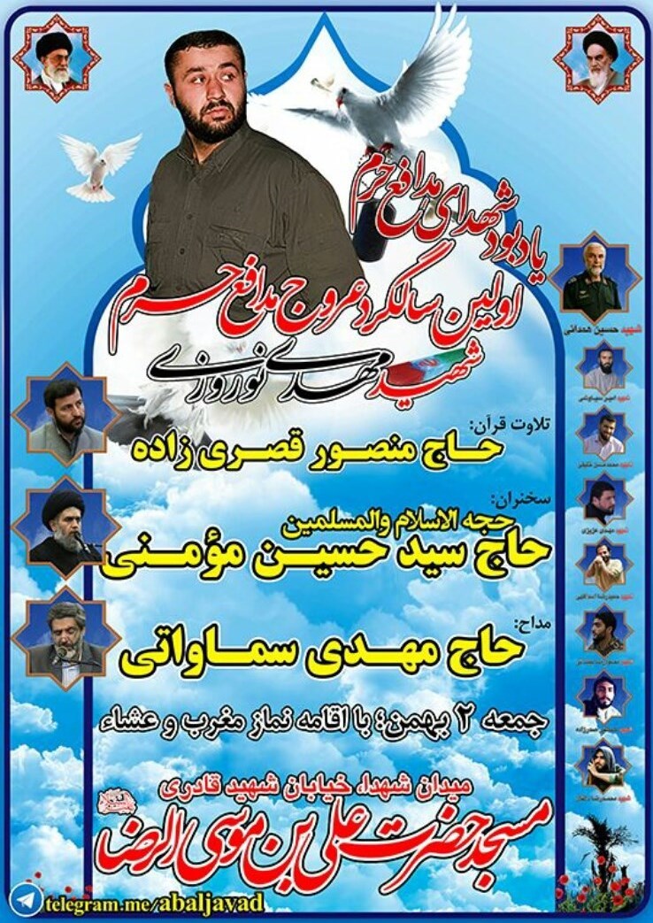 یادواره شهدای مدافع حرم با تلاوت قرآن توسط منصور قصری زاده، سخنرانی حجت الاسلام سید حسین مومنی و مداحی مهدی سماواتی همراه خواهد بود. این مراسم در مسجد حضرت علی ابن موسی الرضا(ع) واقع در میدان شهدا، خیابان شهید قادری برگزار میشود.