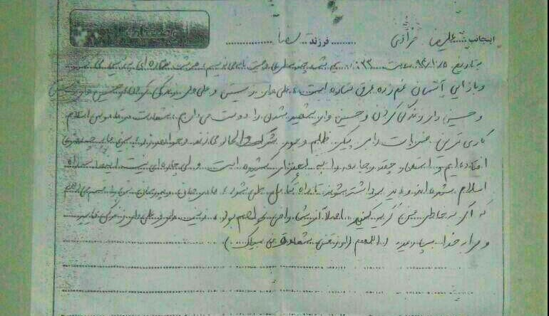 «به تاریخ 5/10/94 ساعت 23 و نیم شب، چند سطری وصیت نامه مینویسم، علی وار زیستن و علی وار زندگی کردن را و حسین وار زیستن و حسین وار زندگی کردن و حسین وار شهید شدن را دوست می دارم.