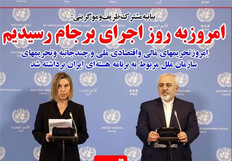وزیر امور خارجه کشورمان و مسئول سیاست خارجی اتحادیه اروپا با قرائت بیانیه‌ای مشترک، به‌صورت رسمی آغاز «روز اجرای» برجام را اعلام کردند.