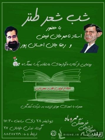 به گزارش گروه رسانه‌های خبرگزاری تسنیم،در این مراسم که در قالب شب شعر طنز بر پا می گردد، ناصر فیض و رضا احسان‌پور به شعرخوانی خواهند پرداخت.