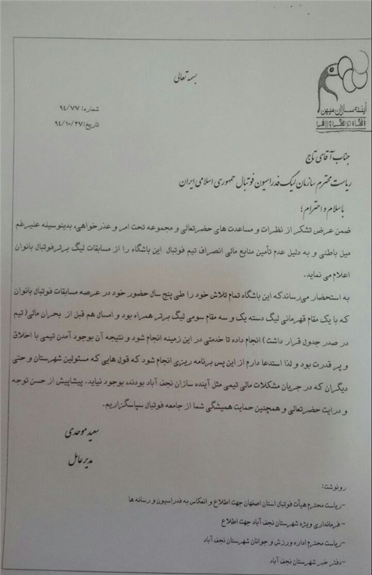 آینده‌سازان از لیگ برتر فوتبال بانوان هم انصراف داد+ تصویر نامه