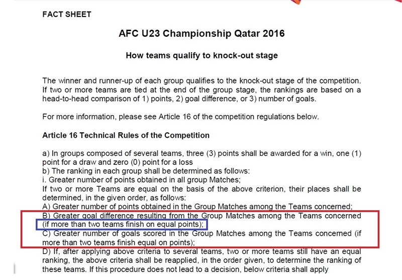 همان‌طور که در گزارش «بررسی وضعیت تیم امید برای صعود» که روز گذشته در تسنیم منتشر شد،  برای صعود تیم‌ها از مرحله گروهی مسابقات قهرمانی زیر 23 سال آسیا در صورت تساوی امتیاز تیم‌ها، بازی رودررو تعیین‌کننده خواهد بود. در صورت پیروزی امشب سوریه مقابل قطر و برد ایران مقابل چین، سه تیم ایران، قطر و سوریه شش امتیازی خواهند شد و با توجه به اینکه هر سه تیم در بازی‌های رودررو مقابل یکدیگر صاحب پیروزی شده‌اند (ایران مقابل سوریه، سوریه مقابل قطر و قطر مقابل ایران) بازی رودررو نمی‌تواند تعیین‌کننده باشد و تفاضل گل و بعد از آن گل‌زده معیار انتخاب تیم‌های صعودکننده خواهد بود.