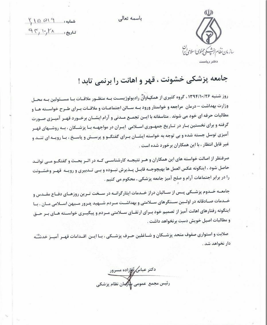 جامعه خدوم پزشکی پس از سالیان دراز خدمات ایثارگرانه در سخت ترین روزهای دفاع مقدس و خدمات صادقانه در نخستین سنگرهای سلامتی و بهداشت مردم شهید پرور میهن اسلامیمان با اینگونه رفتارهای اهانت آمیز از تصمیم خود برای ارتقای سلامتی مردم و پیگیری خواستههای بر حق و مطالبات اصیل خویش دست بر نخواهد داشت.