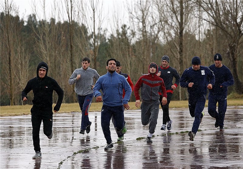 تمرین بارانی تیم ملی کشتی فرنگی در پیست دوومیدانی + تصاویر