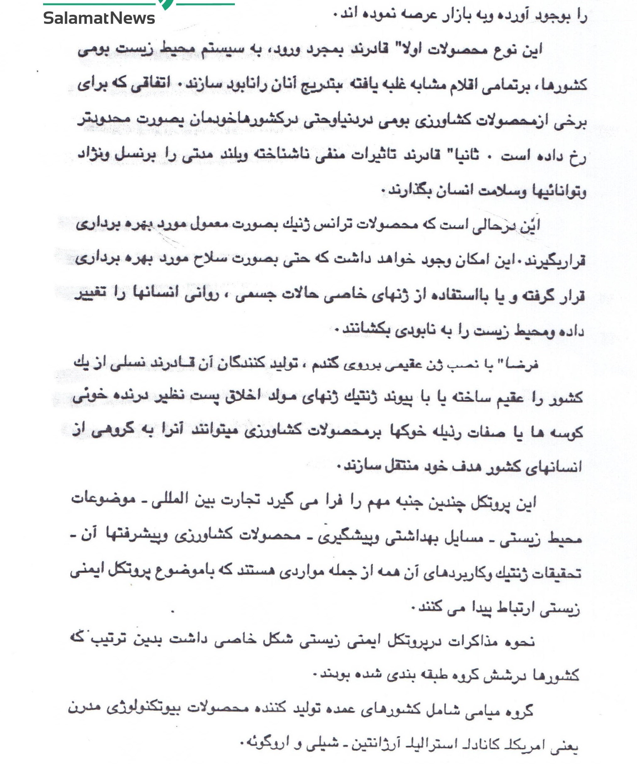 «...، این امکان وجود خواهد داشت که حتی بهصورت سلاح مورد بهره برداری قرار گرفته و یا با استفاده از ژنهای خاصی حالات جسمی، روانی انسانها را تغییر داده و محیط زیست را به نابودی بکشانند.