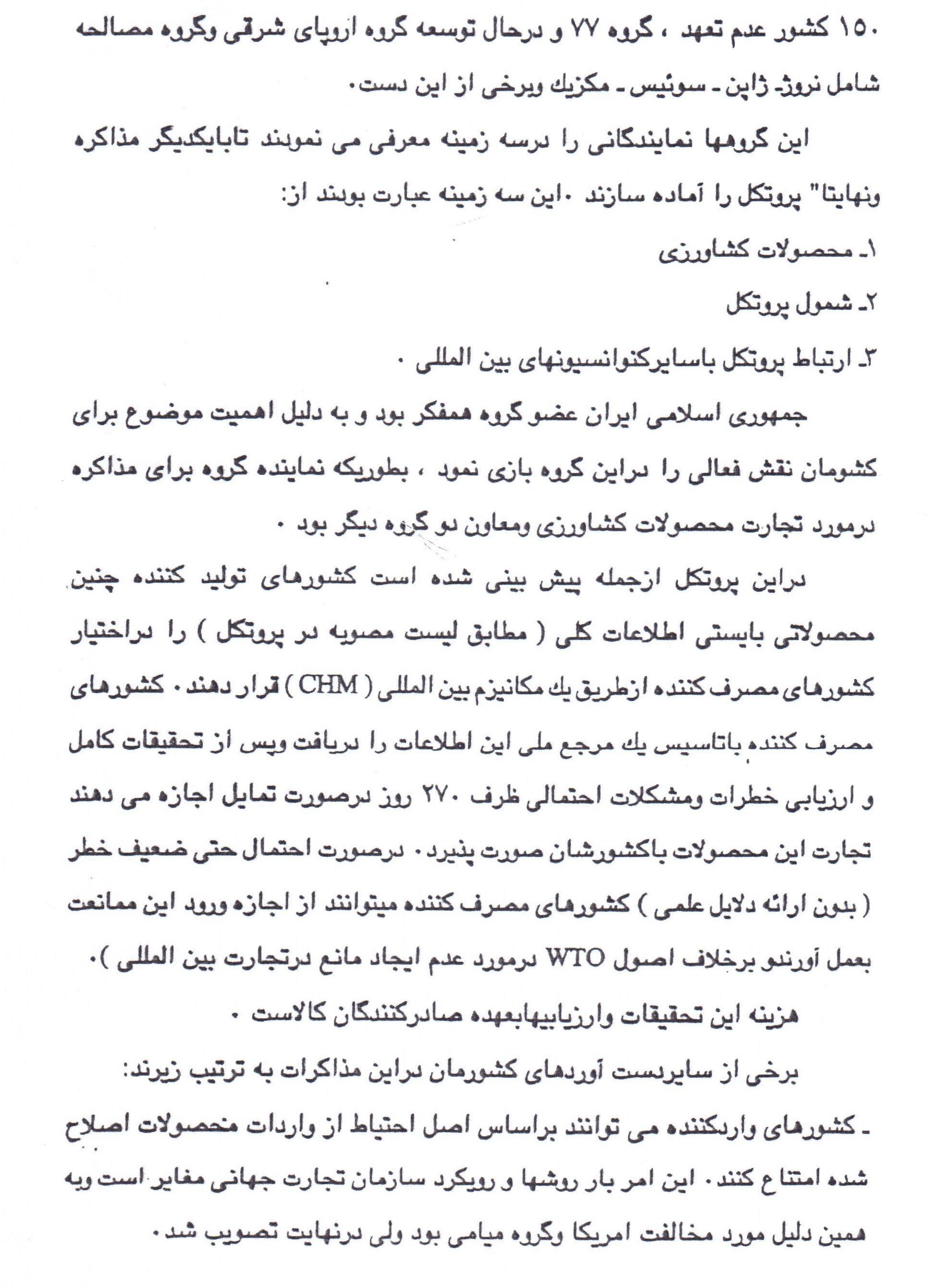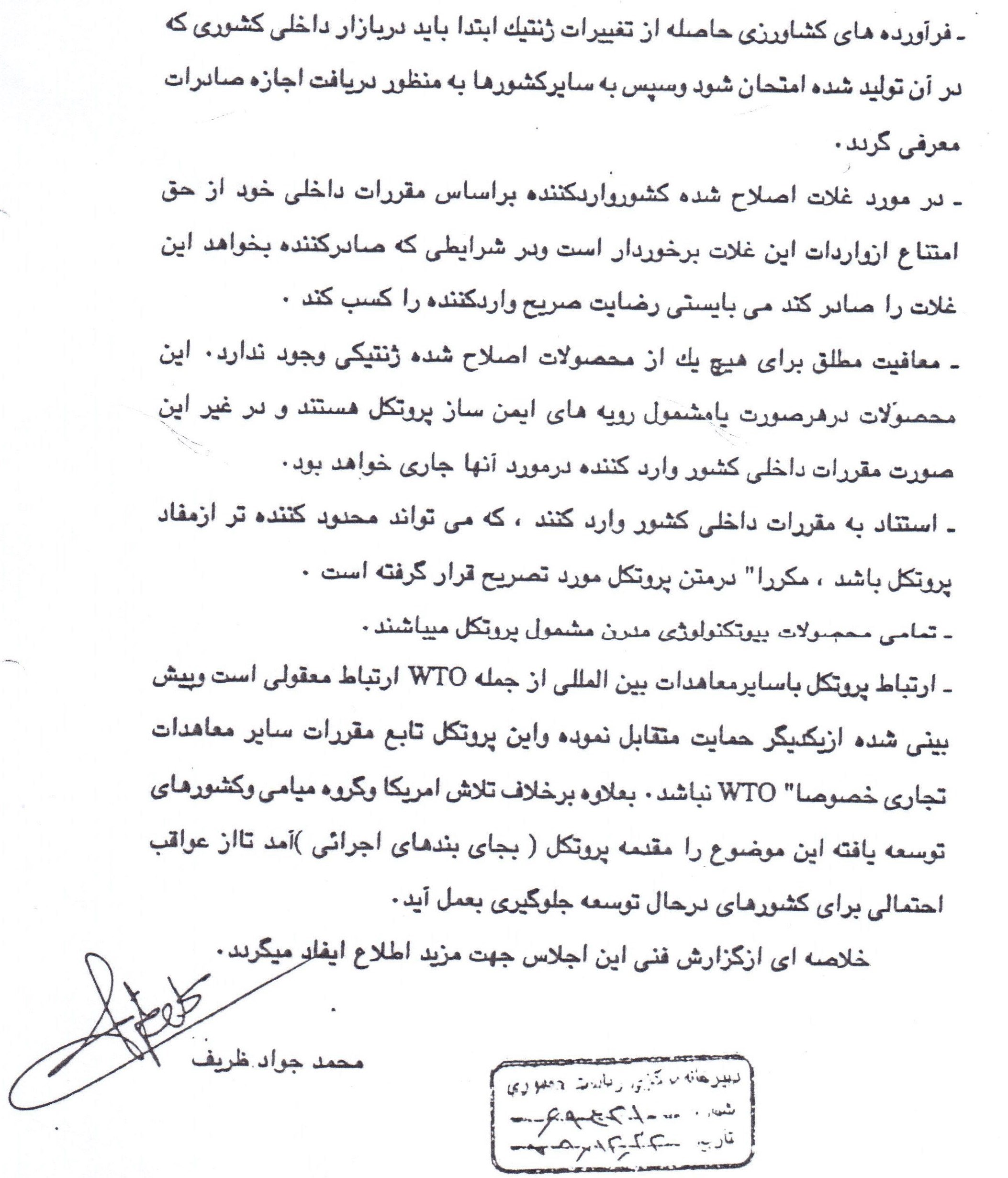 وی در توضیح بیشتر در ارتباط با دلایل و ماجرای نگارش این نامه توسط آقای ظریف درباره محصولات کشاورزی تراریخته (دستکاری ژنتیکی شده) افزود: 16 سال پیش آقایی از وزارت امور خارجه وقت، بر اثر بیاطلاعی و با حضور در نشستی درباره ایمنی زیستی، بدون مشورت با سایر اعضای گروه اعزام شده به این نشست، اقدام به تهیه پیشنویسی میکند و بنا بر اعتمادی که آقای ظریف به مدیر زیردست خود داشت این نامه را امضا و (به دفتر ریاست جمهوری) ارسال میکند.