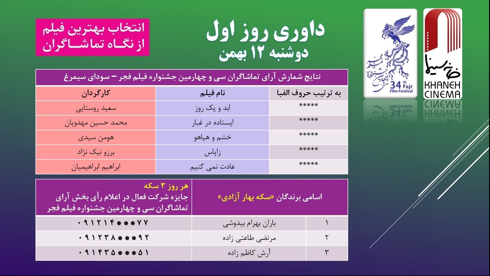 در حالی آرای مردمی فجر در روز نخست اعلام میشود که در سالهای گذشته در روز نخست آرای مردمی اعلام نمیشد تا چند روز از جشنواره بگذرد و فیلمها همه در سانسهای مختلف به نمایش دربیایند.