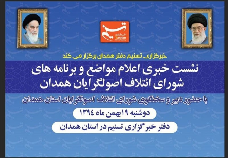 به گزارش خبرگزاری تسنیم از همدان، این نشست خبری روز دوشنبه نوزدهم بهمنماه و ساعت 10 صبح در دفتر خبرگزاری تسنیم در استان همدان برگزار و دبیر و سخنگوی شورای ائتلاف اصولگرایان همدان به سوالات خبرنگاران رسانههای گروهی فعال در استان همدان پاسخ میدهد.