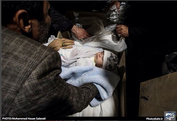 فرزند دوم شهید جواد محمدی، علی اکبر نام دارد. او دو روزه بود که پدر راهی سوریه شد. علی اکبر حالا در 40 روزگی با پیکر مطهر پدر برای آخرین بار وداع میکند. تصویر وداع فرزند چهل روزه شهید جواد محمدی با پیکر پدر ثبل از مراسم خاکسپاری در ادامه قابل مشاهده است:
