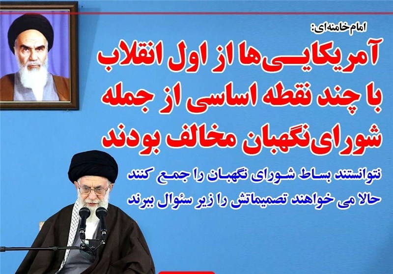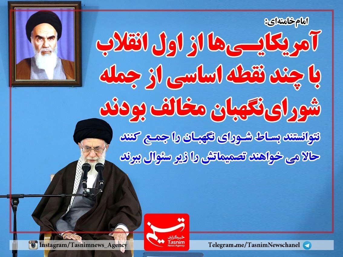 رهبرانقلاب فرمودند:آمریکایی‌ها از اول انقلاب با چند نقطه‌ی اساسی از جمله «شورای نگهبان» مخالف بودند،نتوانستند بساط شورای نگهبان را جمع کنند، حالا می‌خواهند تصمیمات آن را زیر سؤال ببرند که معنای آن غیرقانونی بودن انتخابات و مجلس و قوانین مجلس است.