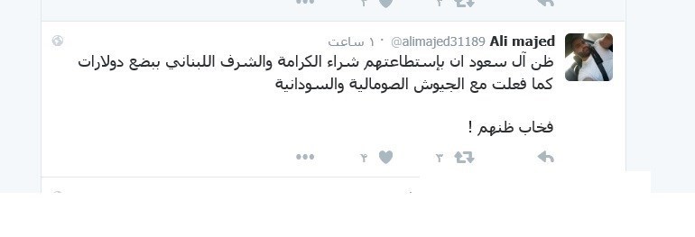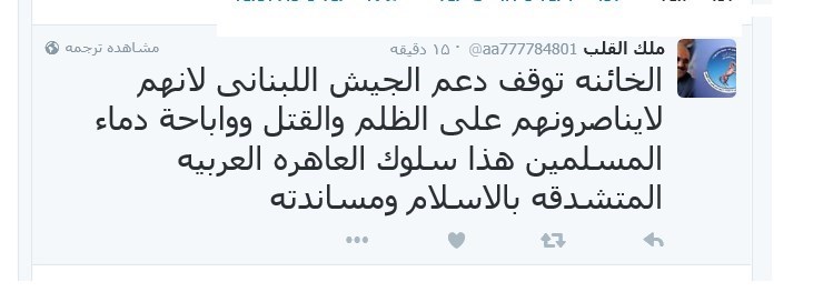 کاربری با اسم ملک القلب نوشت: این خائن حمایت از ارتش لبنان را متوقف کرد؛ چرا که آنها (ارتش لبنان) سعودی ها را در ظلم و قتل و مباح شمردن خون مسلمانان همراهی نمیکنند....