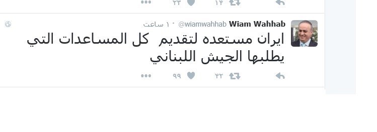 «ویام وهاب» وزیر سابق محیط زیست لبنان در صفحه خود مینویسد: ایران آمادگی دارد تمامی کمکهایی که ارتش لبنان خواستار آن است را ارائه کند.