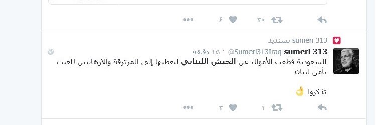 کاربری در این باره نوشت: عربستان اموال را به روی ارتش لبنان قطع کرد تا آنها را به مزدوران و تروریست ها بدهد تا بدین وسیله امنیت لبنان را به هم بریزند.
