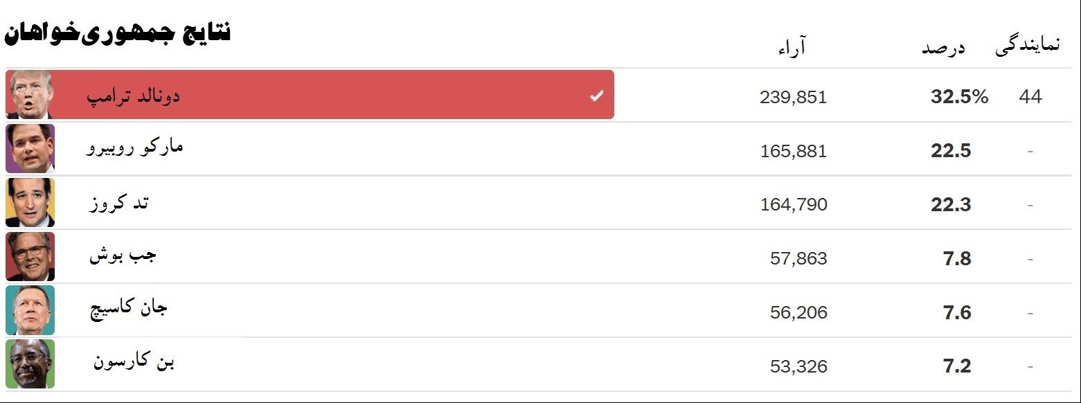ترامپ با این پیروزی توانست حداقل 44 نمایندگی از 50 نمایندگی این ایالت در انتخابات درونحزبی جمهوریخواهان را به دست آورده و تعداد نمایندگیهای خود را به 61 برساند. کروز تاکنون 11 و روبیون نیز 10 نمایندگی را به دست آورده است. جمهوریخواهان برای به دست آوردن نامزدی این حزب در انتخابات ریاستجمهوری به 1237 نمایندگی نیاز دارند.