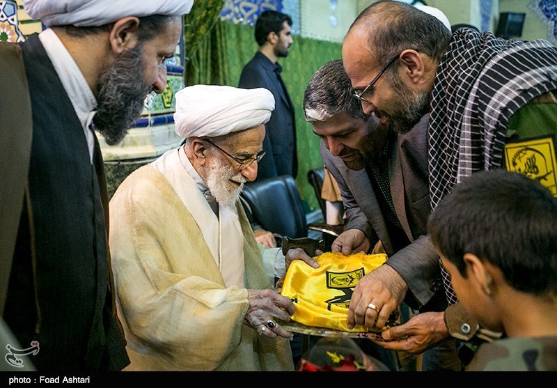 عکس/ بوسه آیت الله جنتی بر پرچم مدافعان حرم