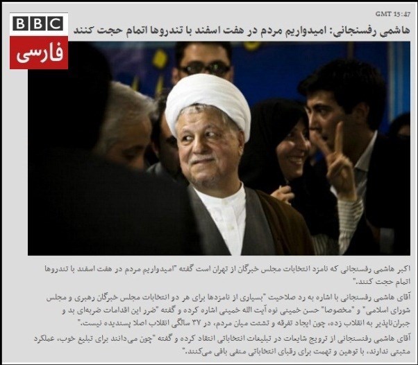 به گزارش گروه رسانه های خبرگزاری تسنیم ، اگر چه اصلاح طلبان و حامیان دولت منکر حمایت انگلیس و رسانه های ملکه از خود می شوند اما نگاهی به رویکرد رسانه های بیگانه و اپوزیسیون نشان می دهد که نه فقط بی بی سی بلکه همه رسانه های معاند نظام اسلامی طی ماه ها و روزهای اخیر به خط شده اند تا بتوانند به لیست ائتلاف اصلاح طلبان و حامیان دولت جهت پیروزی در انتخابات کمک کنند.