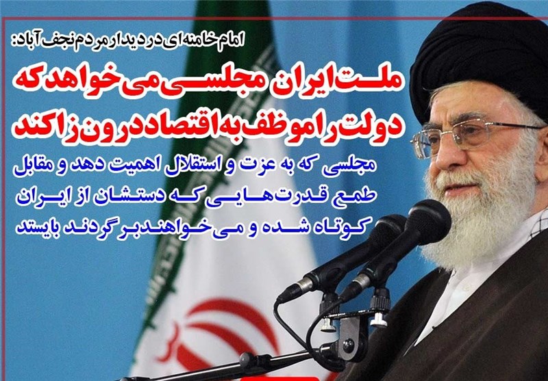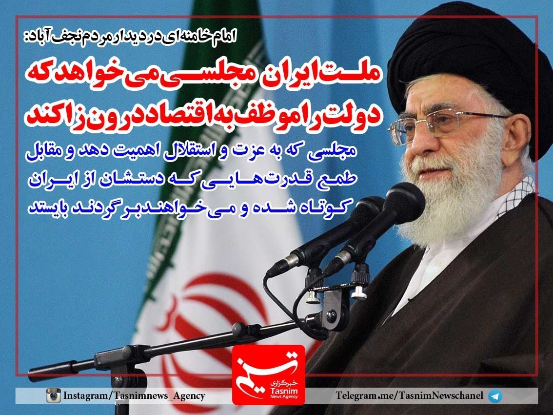 حضرت آیت‌الله خامنه‌ای در دیدار مردم نجف آباد:مجلسی که به عزت و استقلال اهمیت دهد و مقابل طمع قدرت هایی که دستشان از ایران کوتاه شده و می خواهند برگردند بایستد.