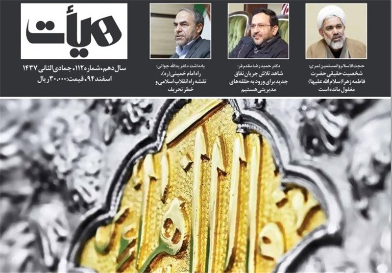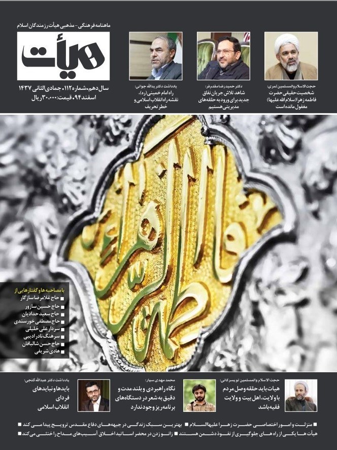 به گزارش خبرگزاری تسنیم، شماره 112 ماهنامه هیأت به مدیرمسئولی حاج صادق آهنگران و سردبیری هادی شریفی با گفتار و مصاحبه هایی از حجج اسلام ثمری و تویسرکانی، حمیدرضا مقدم فر، یدالله جوانی، عبدالله گنجی، علی خلیلی، نادر ادیبی، محمد مهدی سیار، هادی شریفی و مداحان اهل بیت(ع) حاج غلامرضا سازگار، حاج حسین سازور، حاج سعید حدادیان، حاج مصطفی خورسندی، حاج حسن شالبافان با مطالبی پیرامون فاطمیه، انتخابات و نفوذ منتشر شد.