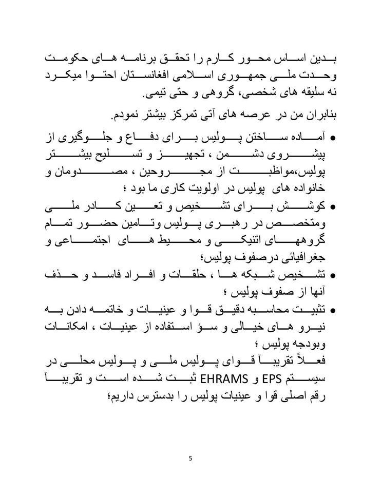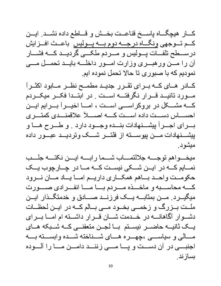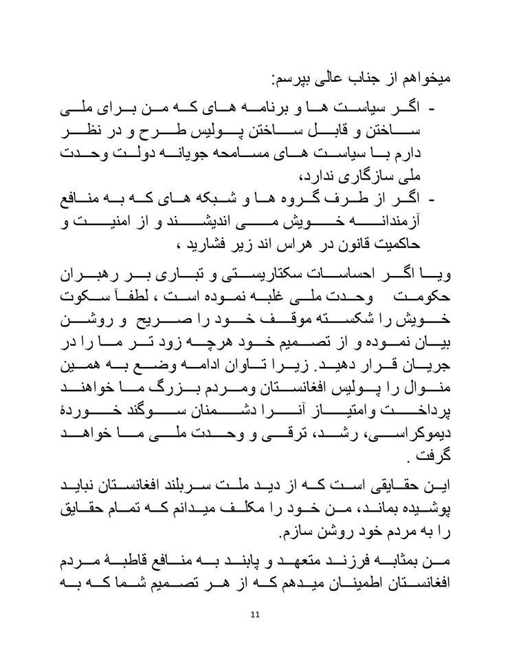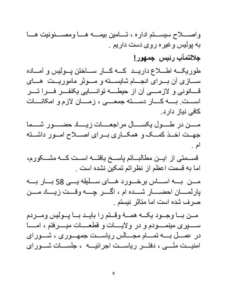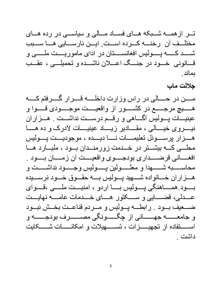 وی در بخشی از این یادداشت نوشت: بیتوجهی ریاست جمهوری افغانستان به خواستههای اصلاحاتی ما در پلیس، باعث افزایش تلفات نیروها و غیرنظامیان شد که فشار آن را رهبری وزارت کشور متحمل میشد.