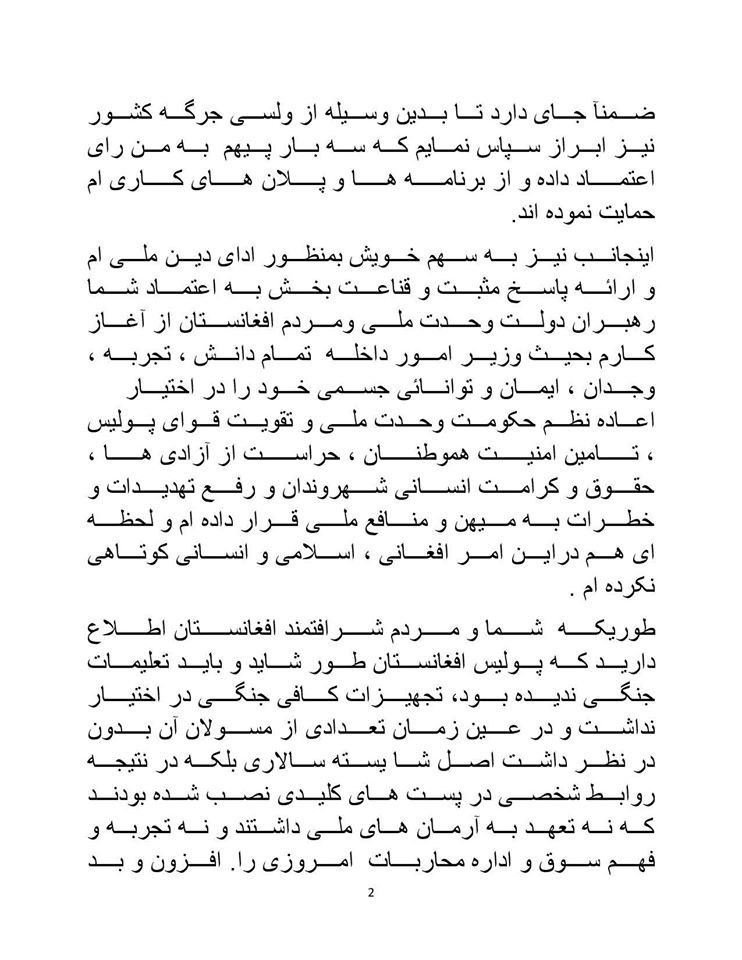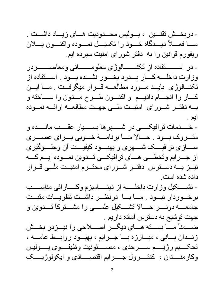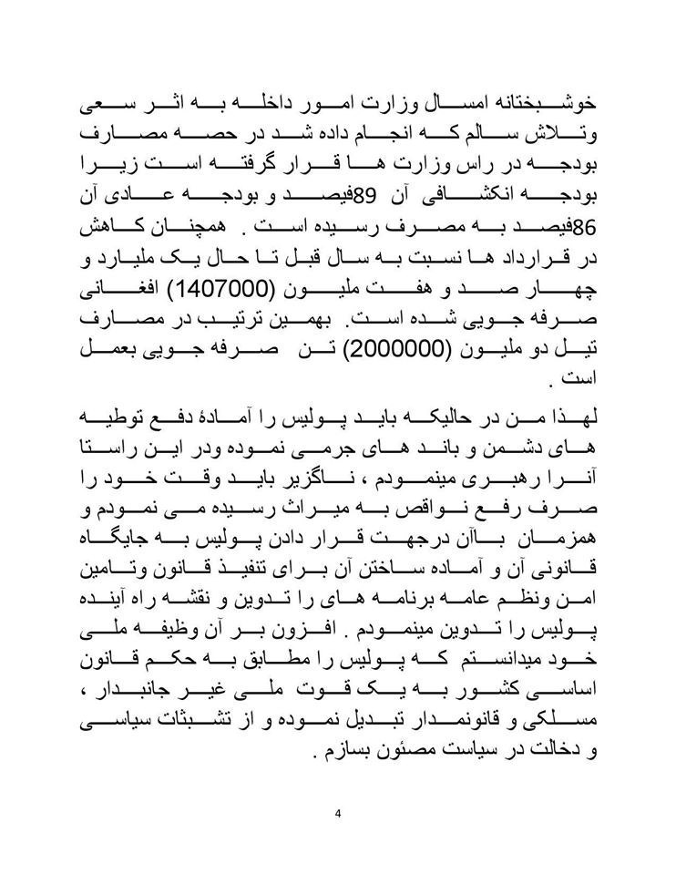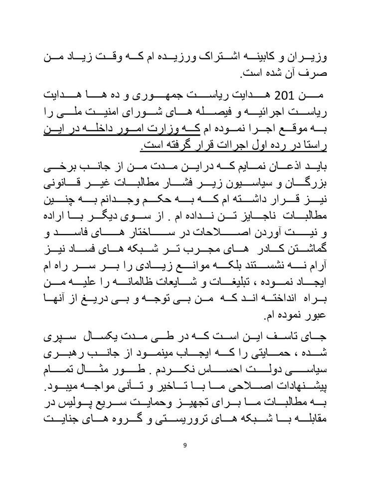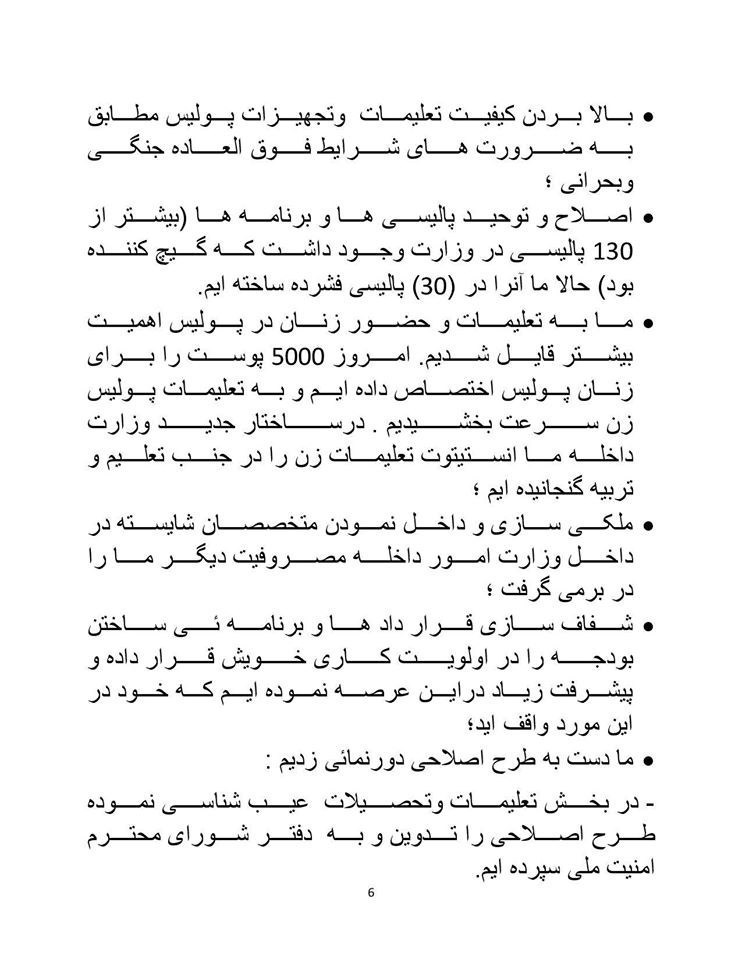 وی در بخشی از این یادداشت نوشت: بیتوجهی ریاست جمهوری افغانستان به خواستههای اصلاحاتی ما در پلیس، باعث افزایش تلفات نیروها و غیرنظامیان شد که فشار آن را رهبری وزارت کشور متحمل میشد.