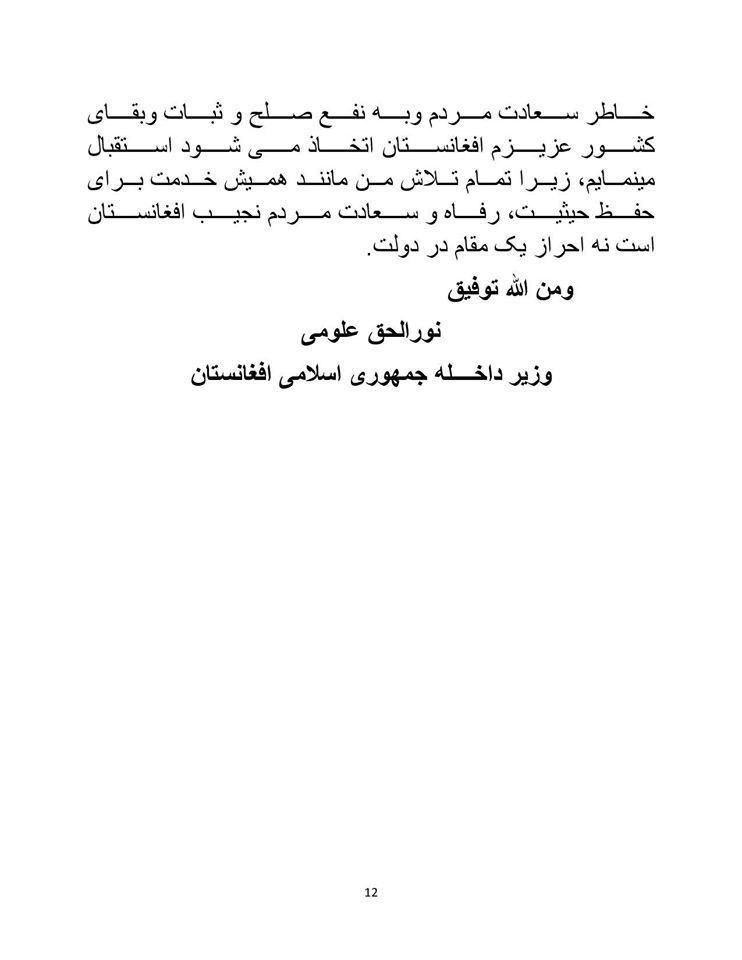 به گزارش دفتر منطقهای خبرگزاری تسنیم، «نورالحق علومی» وزیر کشور سابق افغانستان در یادداشتی 12 صفحهای که به شورای امنیت ملی این کشور ارسال کرد دلایل استعفای خود را از سمتش به اعلام کرد.