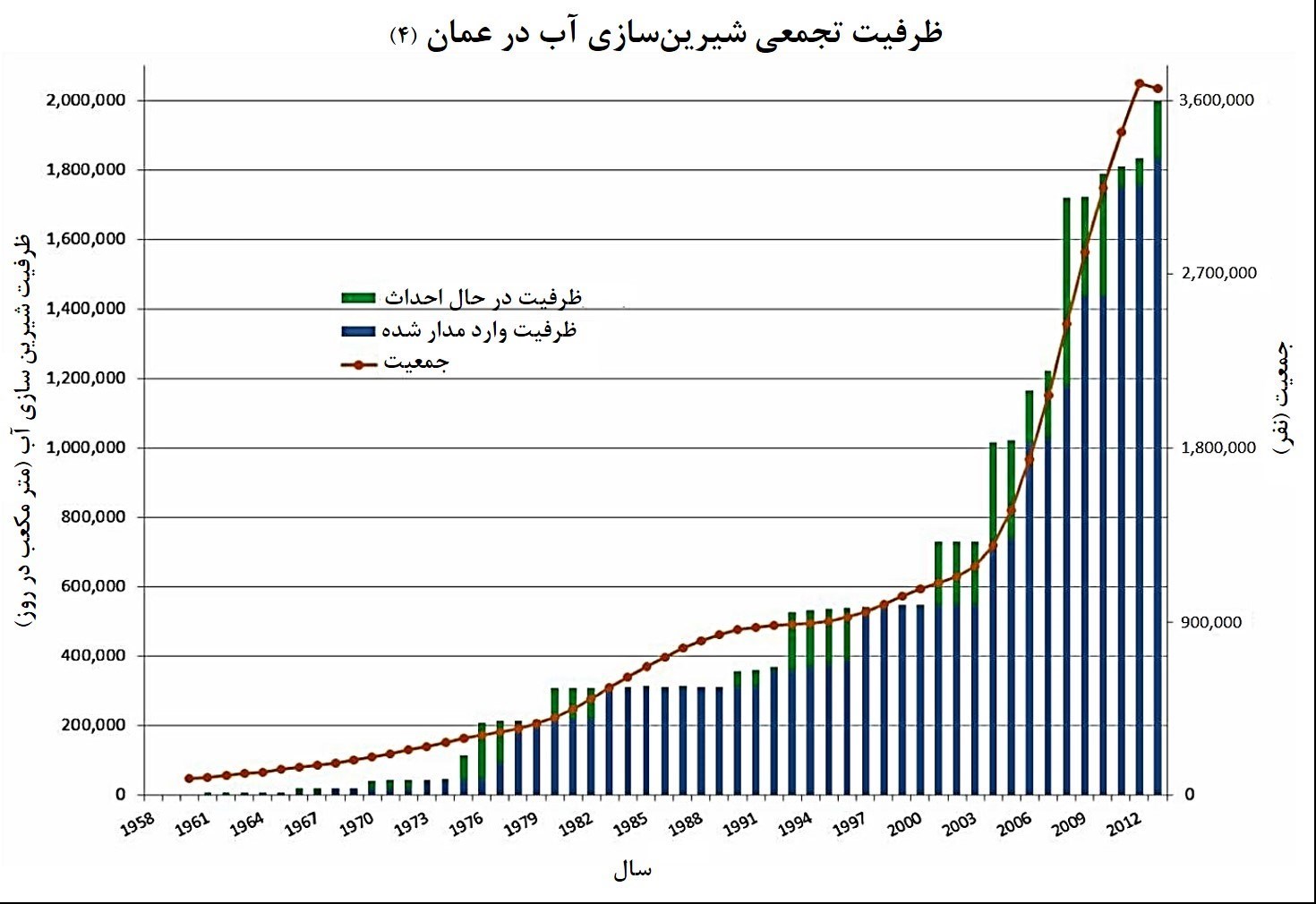 عمان توانسته است با اتخاذ راهبرد شیرینسازی آب، آب مورد نیاز برای توسعه و رشد صنعتی و جمعیتی خود را تأمین کند به نحوی که ظرفیت شیرینسازی آب در این کشور از صفر متر مکعب در روز در سال 1960 به بیش از 1.8 میلیون متر مکعب در روز در سال 2012 رسیده است و 90% از آب شرب در این کشور با آبشیرینکنها تأمین میشود. بر اساس آمارهای بانک جهانی این کشور در 10 سال اخیر به طور میانگین 4% رشد تولید ناخالص داخلی و 6% رشد جمعیت داشته است(3) و در این سالها به طور میانگین سالانه 13% ظرفیت آبشیرینکنهای خود را افزایش داده است.