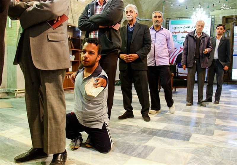 عکسی از یک فرد با شرایط خاص جسمی در پای صندوق رای منتشر می شود.