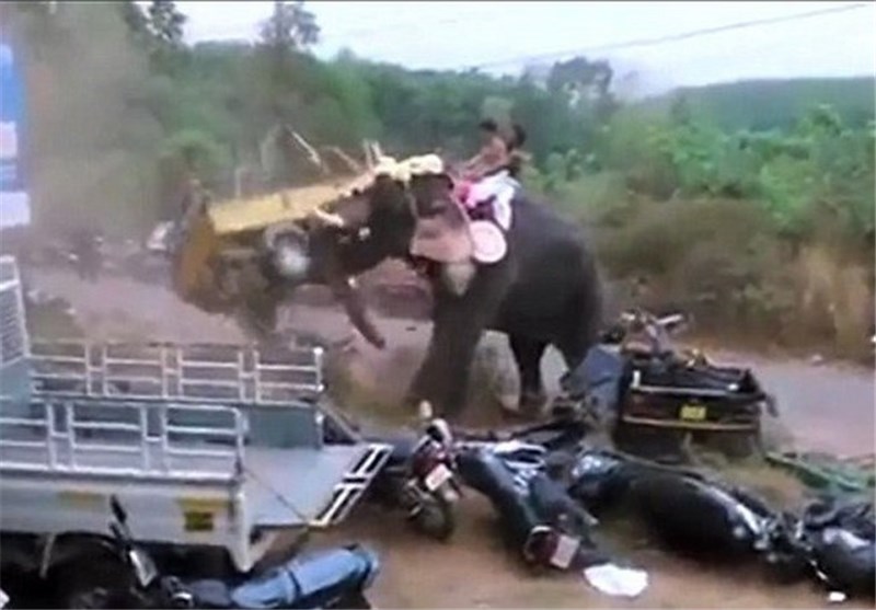 تصاویر نشان میدهد این فیل، به راحتی موتورسیکلت و خودروها را از زمین بلند کرده و به اطراف پرت میکند.