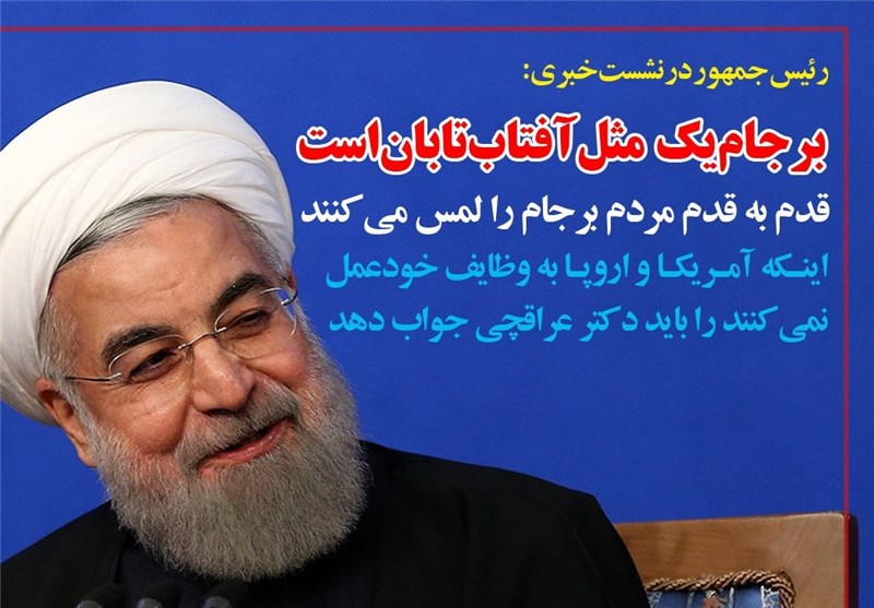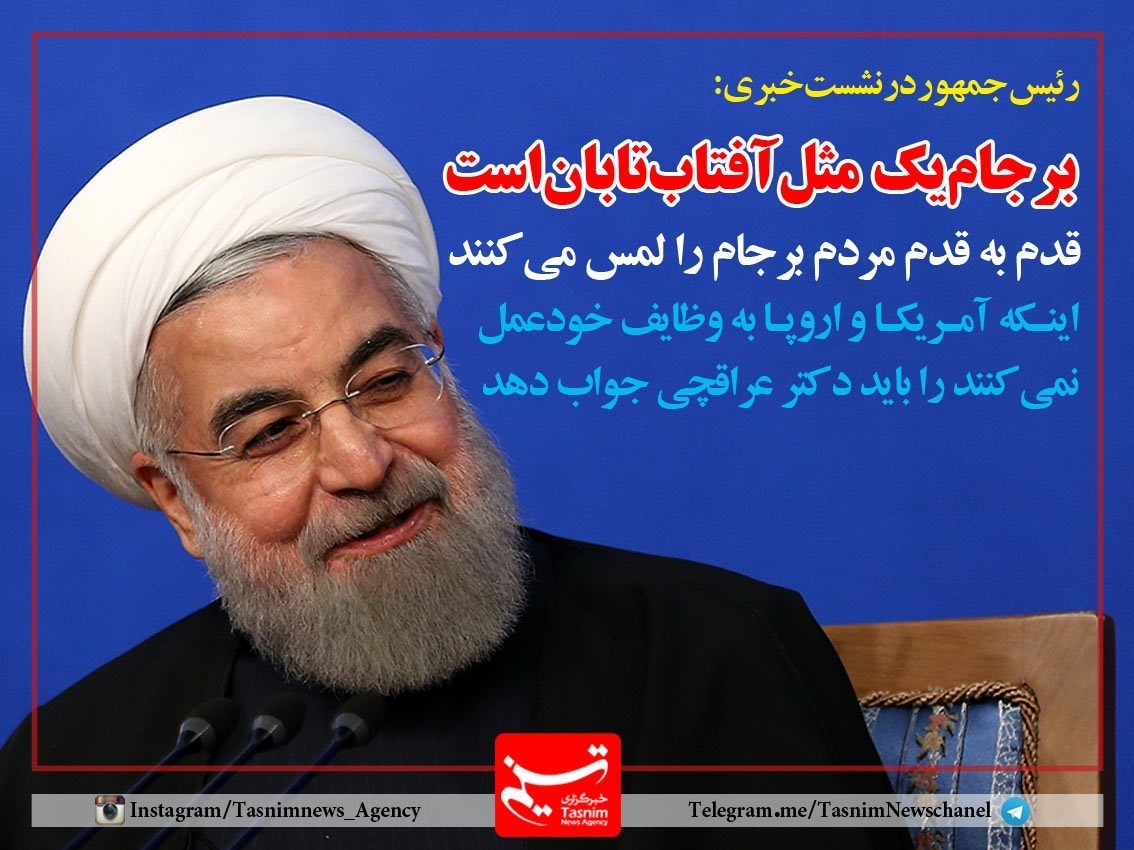 رئیس جمهور با تأکید براینکه برجام یک مانند آفتاب تابان است، تصریح کرد: چشم‌ها را باید باز کرد. در مورد اینکه اروپا و آمریکا به وظایف خود عمل نمی‌کنند باید بگویم که آقای عراقچی که مسئول اجرای برجام در کشور است.