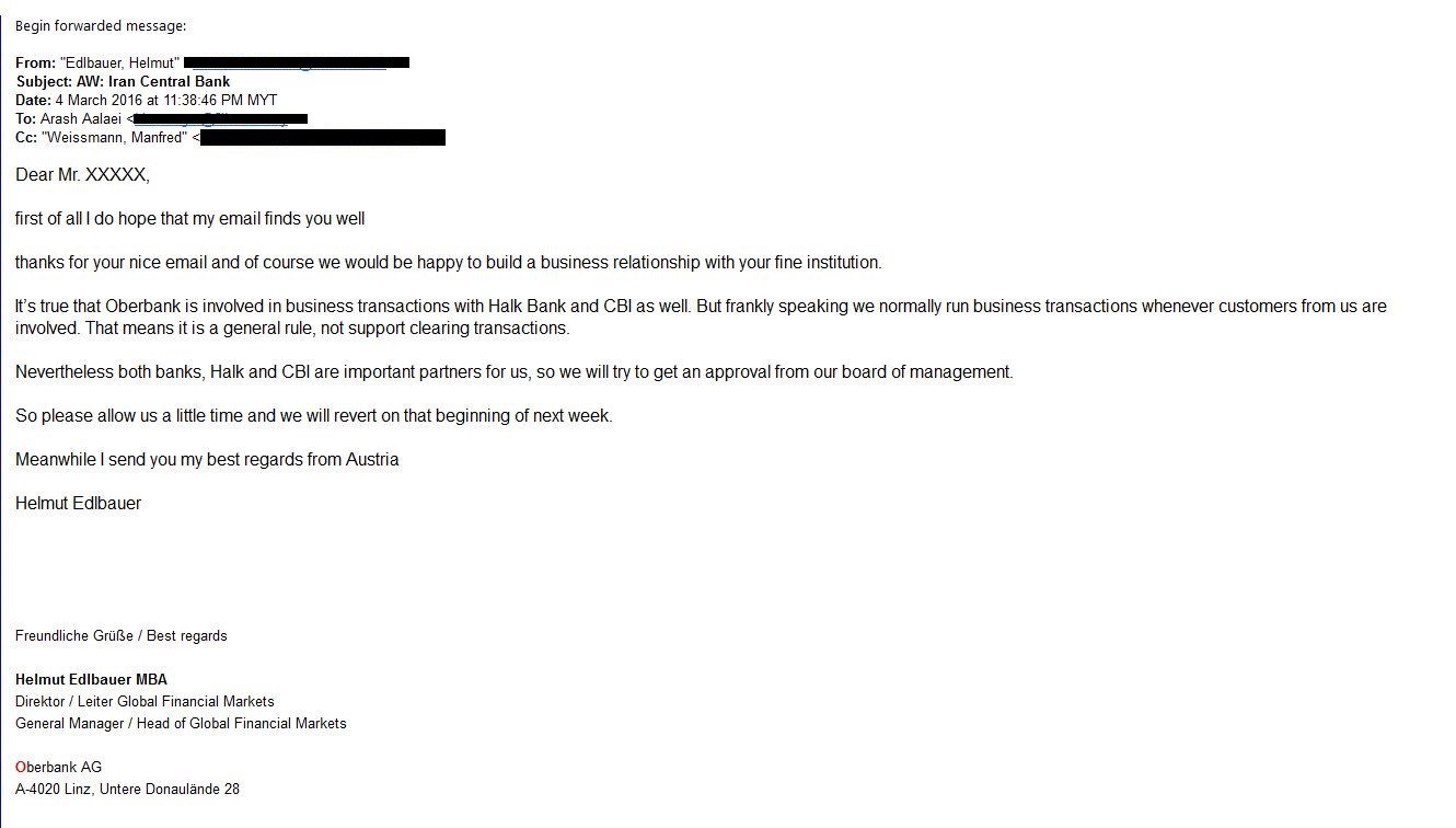 «هلمت ادلباور» مدیر بازارهای مالی اوبر بانک به بانک مالزی پاسخ می‌دهد «پیش از هر چیز٬ امیدوارم که حالتان خوب باشد. از پیام صمیمانه‌تان سپاسگزارم و البته که ما خوشحال خواهیم شد با مؤسسه شما روابط تجاری خود را برقرار سازیم. ارتباط مالی اوبربانک با هالک بانک و همچنین CBI صحت دارد اما صادقانه باید عرض کنم که اصولاً این ارتباط صرفاً جهت  نقل و انتقالات مشتریان ما استفاده می‌شود و به‌عبارتی٬ قاعدتاً ما سرویس کلیرنس برای دیگران انجام نمی‌دهیم. با وجود این، هر دو بانک هالک و CBI شرکای مهمی برای ما محسوب می‌گردند٬ بنابراین ما سعی می‌کنیم از هیئت مدیره مجوز این کار را دریافت کنیم. خواهشمندم به ما قدری فرصت دهید تا اوایل هفته آینده پاسخ شما را خواهیم داد».