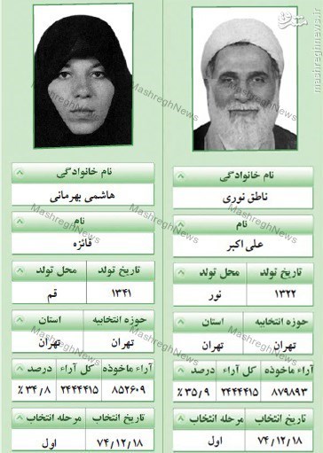 فائزه هاشمی در پاسخ به این سؤال که «بالاخره آرای شما در حوزه تهران بیشتر بود یا آقای ناطق نوری» اظهار داشت: «خودمان هم نفهمیدیم. مامان معتقد است که من اول بودم و آمدند با بابا توافق کردند که نتیجه اینگونه اعلام شود؛ اما همه اینها در ابهام است و هیچچیز آن مشخص نیست.