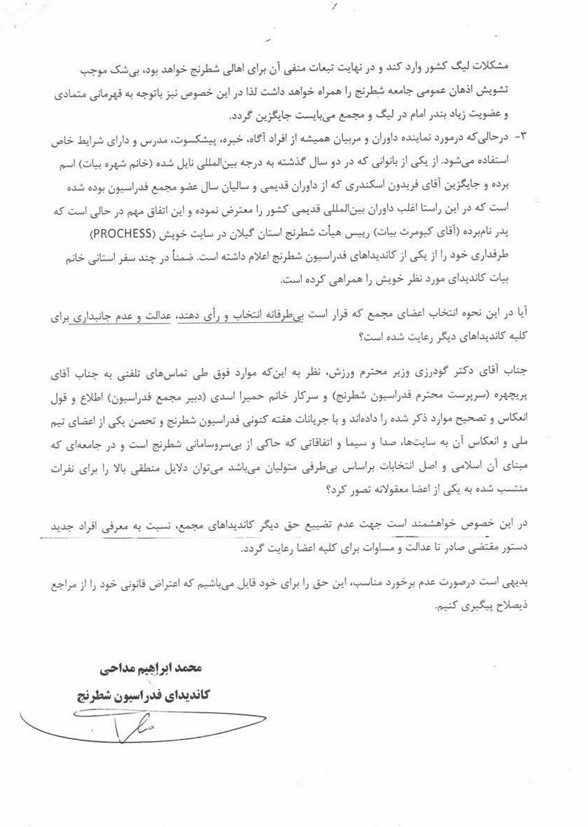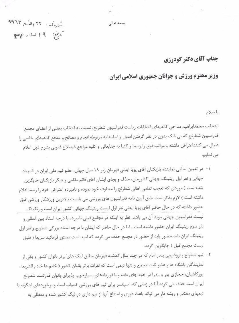 تصویر متن نامه مداحی به وزیر ورزش و جوانان در زیر آمده است: