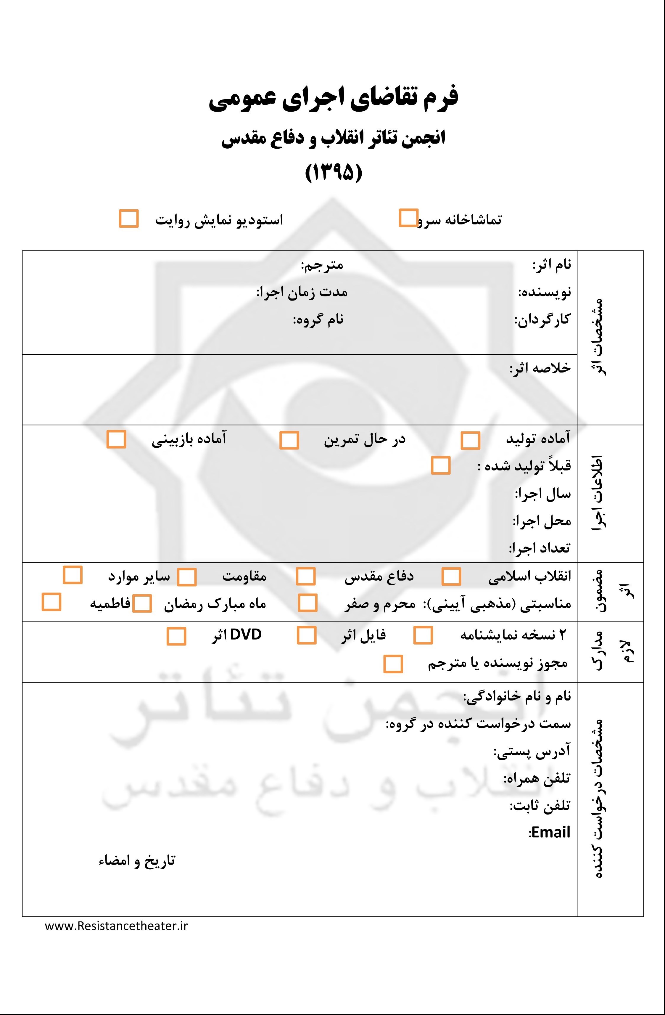 - فرم درخواست در سایت تئاتر مقاومت به نشانی WWW.Resistancetheater. irدر دسترس عموم علاقمندان می باشد.