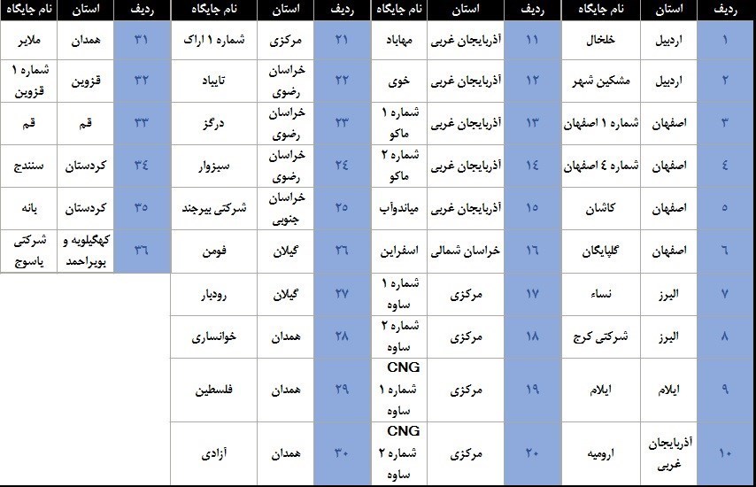در جدول زیر، استان و نام جایگاههای به مزایده گذشته را مشاهده می کنید.